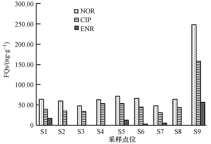 從圖 1可見,9個采樣點均可檢測到NOR和CIP,S2、S3、S4、S8均未檢測到ENR.各樣點FQs含量均為NOR>CIP>ENR.S9的FQs含量最高,NOR含量最高為248.25 ng · g-1,CIP最高為158.69 ng · g-1,ENR最高為56.81 ng · g-1.
