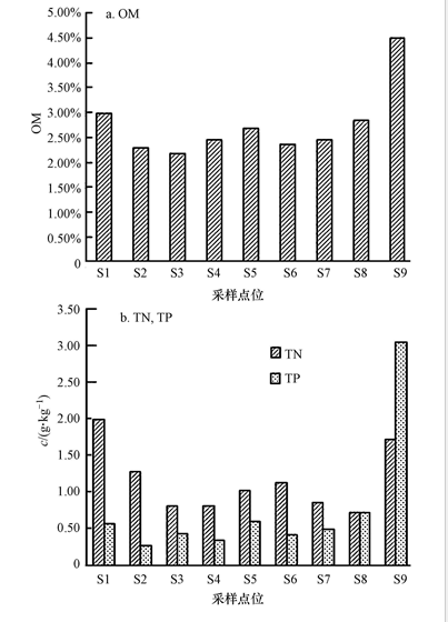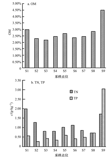 各樣點OM含量變化范圍在0.955%~5.598%,S9測得最大值為4.51%,差異極顯著(p<0.01).各樣點TN含量變化范圍在0.59~1.73 g · kg-1,平均值為1.15 g · kg-1,差異極顯著(p<0.01).各樣點TP含量變化范圍在0.27~3.06 g · kg-1,平均值為0.77 g · kg-1,有顯著差異(p<0.05).