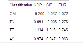 對NOR、CIP及NOR含量與OM、TN、TP進行多元線性回歸分析(見表 2),sig均小于0.001,R2在0.947~0.974間,回歸方程有效,回歸模型與實驗得到的數(shù)據(jù)均吻合較好.從多元回歸分析中得出NOR、CIP及NOR含量主要取決于TP的含量(表 2).