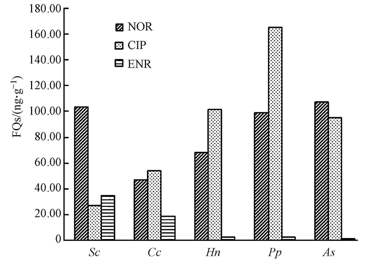 從圖 3可見,5種魚肉中均檢測出了NOR、CIP、ENR的存在.Cc、Hn和Pp魚肉中檢測到CIP>NOR>ENR,As、Sc魚肉中檢測到NOR>CIP>ENR,5種魚肉中ENR的含量相對低于NOR及CIP的含量.As魚肉中NOR含量最高為106.85 ng · g-1,Pp魚肉CIP含量最高為165.15 ng · g-1.