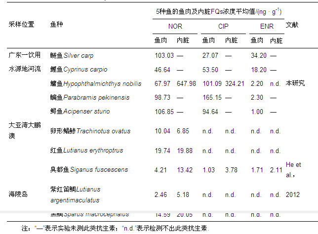 本研究測得5種魚的魚肉中的FQs含量均顯著高于大亞灣大鵬澳和海陵島中魚的FQs的含量;部分魚類魚肉和內(nèi)臟中NOR、CIP含量高于美國、歐盟的許多國家的殘留標準(殘留限量為30 ng · g-1),也高于我國農(nóng)業(yè)部標準NY 5070—2001《無公害食品水產(chǎn)品中漁藥殘留限量》的殘留標準(NOR、CIP殘留限量為50 ng · g-1).分析原因乃為同上,主要是養(yǎng)殖魚塘、禽畜養(yǎng)殖業(yè)、城鎮(zhèn)生活污水及感潮河流的滯留效應,導致面源污染嚴重,水體中可能含有較高的FQs含量.Li的研究表明FQs在可食用的軟體動物內(nèi)臟中性質(zhì)穩(wěn)定(Li et al., 2012);孫言春的研究也表明FQs在魚體內(nèi)吸收較快,消除較慢,F(xiàn)Qs在魚體內(nèi)富集作用較強.魚內(nèi)臟部位為代謝器官,因此,更易積累,造成魚內(nèi)臟中抗生素含量較高的現(xiàn)象.魚體內(nèi)臟中FQs含量多數(shù)情況下高于魚肉中FQs含量,這個結(jié)果與He的研究結(jié)果一致.