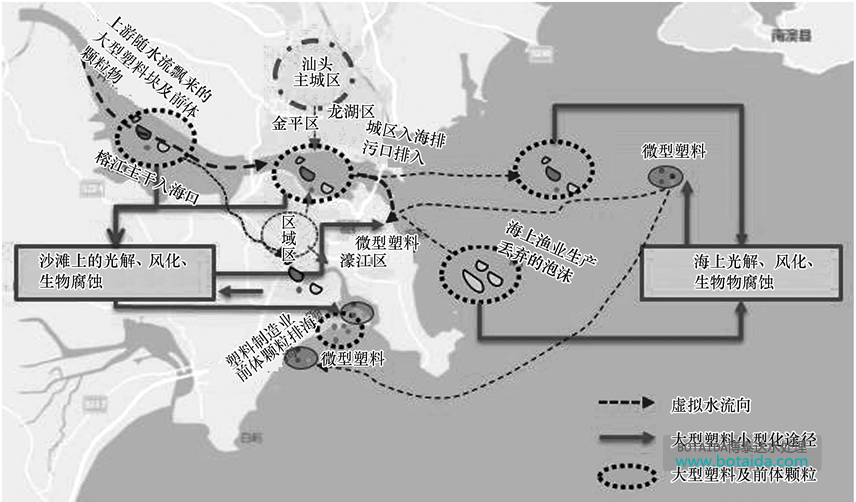 1)大型塑料和前體顆粒物的來(lái)源有:榕江上游隨水流飄入的部分,沿岸城區(qū)排放入海的部分,以及周?chē)芰霞庸I(yè)排入環(huán)境中的前體顆粒.
