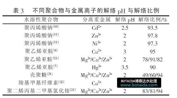 由表3 可知,使用酸化再生法時,解絡(luò)pH 一般在2~3?在選定解絡(luò)pH 后,解絡(luò)的效果受聚合物與金屬離子影響?而同一金屬離子與不同聚合物在同一pH 條件下的解絡(luò)效果差異也較大〔21-22〕?