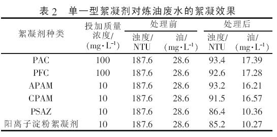 單一型絮凝劑對煉油廢水的絮凝效果如表2所示?