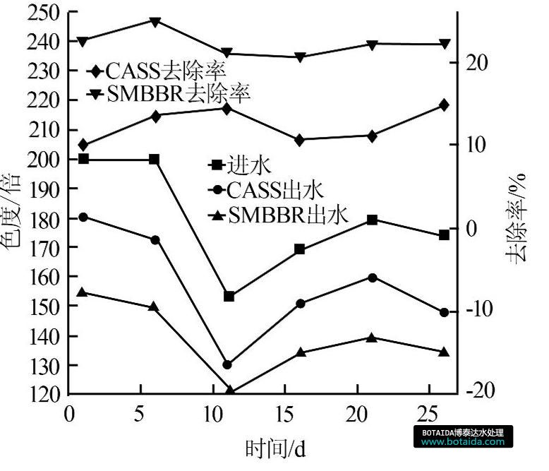 CASS工藝和SMBBR工藝對色度的去除效果對比見圖5。