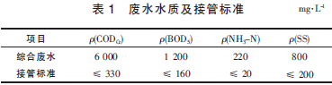 醫(yī)藥中間體生產(chǎn)廢水由工藝廢水和生活污水2部分組成,綜合廢水水質(zhì)指標(biāo)均為平均值,排放標(biāo)準(zhǔn)執(zhí)行當(dāng)?shù)貓@區(qū)污水處理廠的接管標(biāo)準(zhǔn)。廢水水質(zhì)及接管標(biāo)準(zhǔn)見表1。廢水產(chǎn)生量約為260 m3/d,設(shè)計(jì)處理量為300 m3/d。