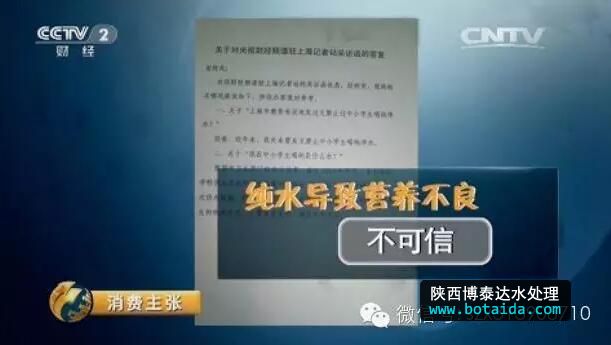 CCTV《消費(fèi)主張》欄目,辟謠『喝純水會(huì)導(dǎo)致?tīng)I(yíng)養(yǎng)不良』。北京世紀(jì)壇醫(yī)院副院長(zhǎng)指出:“人體內(nèi)營(yíng)養(yǎng)均衡不可能指望水里的那點(diǎn)成分。我們平常的營(yíng)養(yǎng),靠水來(lái)供應(yīng)的話,非常非常少,所以說(shuō),如果說(shuō)長(zhǎng)期喝純凈水,引起營(yíng)養(yǎng)不良,那跟喝水一點(diǎn)關(guān)系也沒(méi)有。”