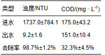 電絮凝工藝能夠降低廢水濁度,去除重金屬、酚和有機(jī)物等(Al-Shannag et al., 2014;2015),具有效率高、無(wú)二次污染(無(wú)需添加化學(xué)藥劑)、污泥產(chǎn)量低、設(shè)備簡(jiǎn)單易模塊化等優(yōu)點(diǎn)(陳斌等,2012;Yousuf et al., 2001).利用電絮凝工藝對(duì)石油裂化催化劑廢水進(jìn)行預(yù)處理,能在一定程度上保證CANON工藝進(jìn)水水質(zhì),減緩重金屬和有機(jī)物對(duì)厭氧氨氧化菌的影響.在極板間距1.5 cm、電解時(shí)間 25 min、電流密度 25 mA · cm-2、pH 9.0的運(yùn)行條件下,考察了電絮凝對(duì)石油裂化催化劑廢水的預(yù)處理效果.結(jié)果表明(表 4):電絮凝出水穩(wěn)定在10 NTU以下,濁度平均去除率為98.7%±1.2%,COD的平均去除率為32.3%±4.5%.分析認(rèn)為,電絮凝產(chǎn)生的Al3+與陰極產(chǎn)生的OH-反應(yīng)生成一系列的單核和多核羥基絡(luò)合物絮體,并通過(guò)吸附、網(wǎng)捕、沉淀等作用將廢水中的有機(jī)物去除(Duan et al., 2003).除此之外,陽(yáng)極產(chǎn)生的氧氣對(duì)廢水中的有機(jī)物有一定的氧化作用(Adhoum et al., 2004).從濁度和COD的去除效果來(lái)看,電絮凝具有一定的抗擊負(fù)荷的能力,可減輕原水水質(zhì)對(duì)后續(xù)CANON工藝的影響.