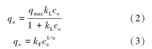 其中,qe為吸附平衡吸附量(mg · g-1),qmax為吸附劑飽和吸附量(mg · g-1),ce為平衡時(shí)溶液中剩余磷濃度(mg · L-1),kL為與熱力學(xué)有關(guān)的常數(shù)(L · mg-1),kF為與吸附強(qiáng)度有關(guān)的常數(shù)(L · g-1),n為與吸附能力有關(guān)的常數(shù).