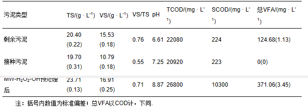 試驗所用剩余污泥取自北京清河污水處理廠,取回后靜置濃縮,置于4 ℃保存.接種污泥取自北京小紅門污水處理廠,為中溫(35℃)厭氧消化出泥.試驗前污泥過18目標(biāo)準(zhǔn)篩以除去大顆粒雜質(zhì).試驗采用MW-H2O2-OH預(yù)處理工藝(Wang et al., 2015;Wang et al., 2009;Xiao et al., 2012;王亞煒,2009;肖慶聰?shù)龋?012;閻鴻,2010),其操作條件如下:加入5 mol · L-1 NaOH溶液,調(diào)節(jié)樣品pH至11,600 W微波功率輻射樣品,升溫至80 ℃,然后按m(H2O2)/m(TS)=0.2加入30%的過氧化氫溶液,繼續(xù)輻射升溫至100℃,結(jié)束.本試驗通過微波-過氧化氫-堿預(yù)處理達(dá)到堿性環(huán)境,以抑制產(chǎn)甲烷過程.試驗所用污泥的主要性質(zhì)見表 2.污泥經(jīng)過MW-H2O2-OH預(yù)處理后,添加100 mg · L-1過氧化氫酶(Sigma),混合完全攪拌一定時間以便將殘留過氧化氫分解完全,之后按照I/S(Inoculum to Substrate,揮發(fā)性固體濃度VS/VS)為0.07的比例進(jìn)行接種污泥接種.之后按照響應(yīng)面法安排進(jìn)行試驗,試驗中采用的蛋白酶酶活為20萬U · g-1(江蘇銳陽生物科技有限公司).
