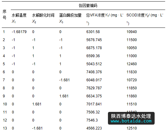 根據(jù)CCD(Central Composite Designs)中心組合試驗設(shè)計原理,在前期單因素試驗的基礎(chǔ)上,選擇水解溫度、水解酸化時間和蛋白酶投加量作為自變量,分別用X1、X2、X3表示,以總VFA濃度和SCOD濃度作為響應(yīng)值,分別用Y1、Y2表示,進(jìn)行響應(yīng)面試驗因素水平安排,具體見表 1.由Design Expert 8.0.6(Stat-Ease),采用CCD試驗設(shè)計原理,得到3因素3水平共20個試驗點的試驗方案,并對試驗數(shù)據(jù)進(jìn)行二次多元回歸擬合.二次多元回歸方程為: