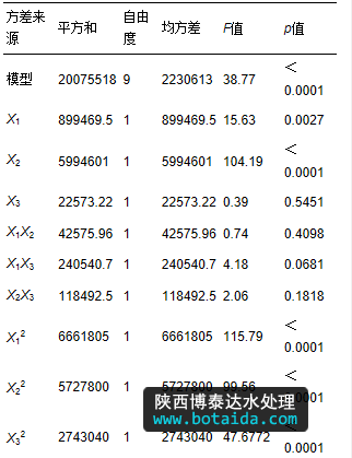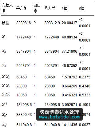 式中,Y為響應(yīng)值;X1、X2、X3為自變量編碼值;B0為常數(shù)項;B1、B2、B3為線性系數(shù);B12、B13、B23為交叉項系數(shù);B11、B22、B33為二次項系數(shù);e為誤差. 對模型進(jìn)行方差分析,并通過模型得到基于微波-過氧化氫-堿預(yù)處理的污泥水解酸化的優(yōu)化工藝條件和最大總VFA濃度.