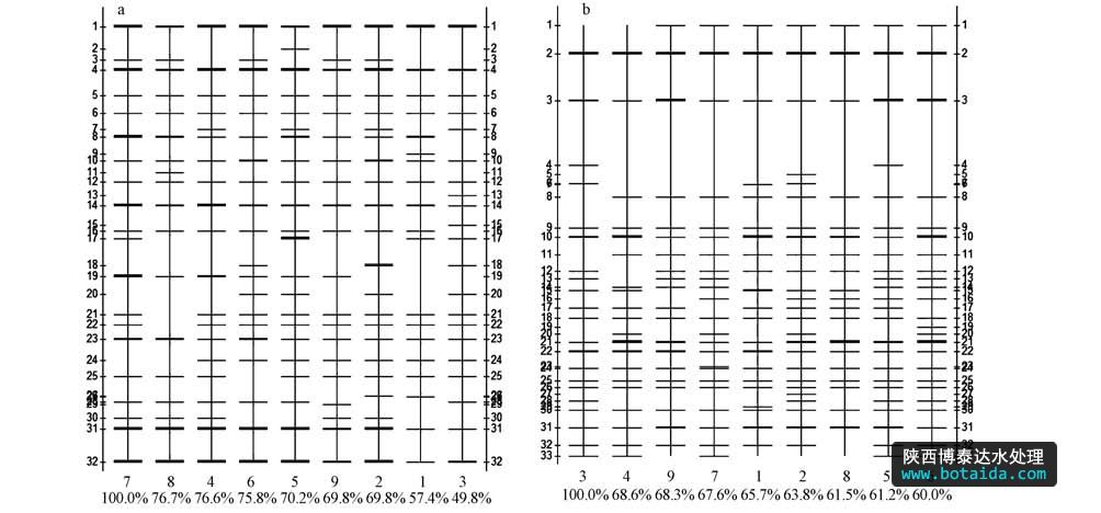 圖3 大亞灣海域浮游細(xì)菌16S rDNA V3區(qū)DGGE圖譜分析帶型圖(其中水平軸上的數(shù)字(1~9)為站點(diǎn)編號,百分比是與標(biāo)準(zhǔn)泳道的匹配度; 垂直軸上的數(shù)字為DNA條帶編號(a. 2010年冬,b. 2011年夏))