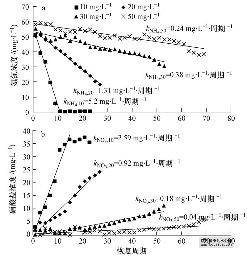 式中,CNH4是出水中NH+4-N濃度(mg · L-1),CNO3是出水中NO-3-N濃度(mg · L-1),t是周期數(shù),kNH4為恢復(fù)期NH+4-N的消耗速率(mg · L-1· 周期-1),kNO3為恢復(fù)期NO-3-N的生成速率(mg · L-1· 周期-1).