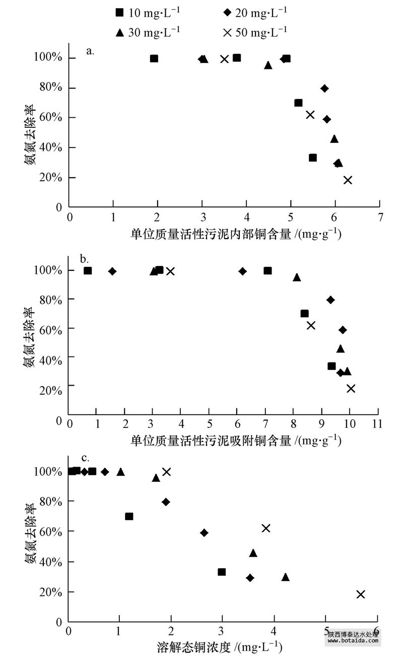 圖 6 不同形態(tài)的銅和氨氮去除率的相關(guān)性(a.活性污泥內(nèi)部的銅;b.活性污泥吸附的銅;c.溶解態(tài)的銅)
