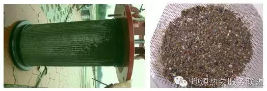 1)防堵塞。未處理原生污水中含有大尺度懸浮物,包括纖維狀的發(fā)絲類(lèi)、紙屑類(lèi)、藻狀類(lèi),普通的換熱設(shè)備是根本無(wú)法承受的。而實(shí)踐證明:已處理污水和地表水中的懸浮物含量相對(duì)較少,盡管與未處理原水不在同一數(shù)量級(jí),但隨著運(yùn)行時(shí)間增長(zhǎng),堵塞問(wèn)題也立即突現(xiàn),原水的堵塞時(shí)間為1~3d,而地表水則為7~10d。圖4是未處理原生污水的堵塞現(xiàn)象,圖5是已處理污水的堵塞狀況。