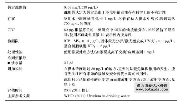 根據(jù)人群接觸高濃度鈾的新的流行病學(xué)研究推導(dǎo)的30μg /L的暫定準(zhǔn)則值,代替原先 根據(jù)實(shí)驗(yàn)動(dòng)物研究推導(dǎo)的暫定準(zhǔn)則值。被認(rèn)定為是基于有關(guān)鈾的毒理學(xué)和流行病學(xué)上的不 確定性以及要實(shí)現(xiàn)更低濃度供應(yīng)在技術(shù)上的困難度。要注意的是,有關(guān)人類群體的研究如 可獲取且質(zhì)優(yōu),則為用于推導(dǎo)健康準(zhǔn)則值相關(guān)信息的首選來(lái)源