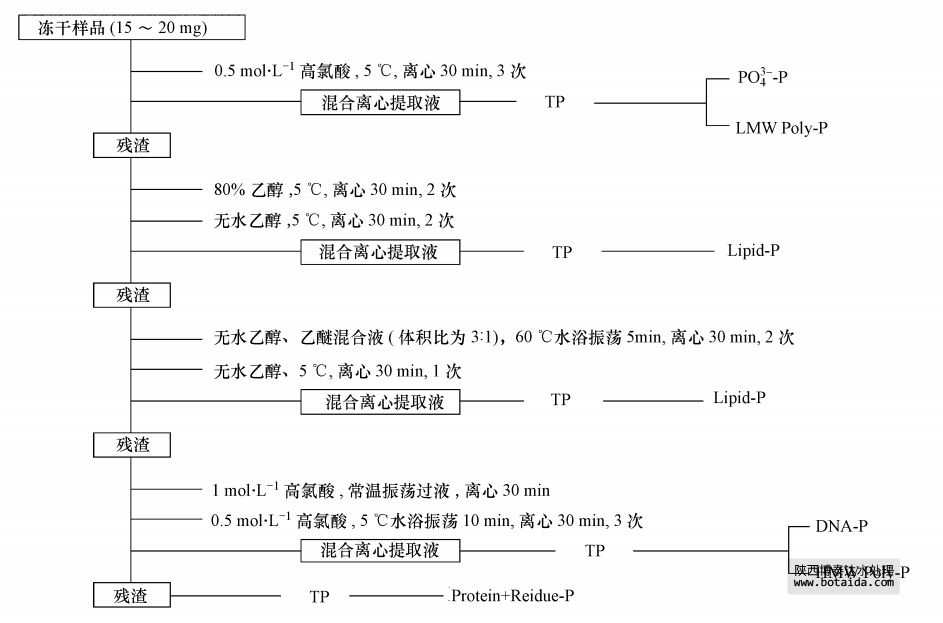 污泥和細(xì)菌細(xì)胞中不同形態(tài)磷含量的測定采用改進(jìn)的STS法,具體測量步驟見圖 1.該法將樣品中的磷分為正磷酸鹽(PO3-4-P)、低分子量聚磷酸鹽(LMW Poly-P)、磷脂(Lipid-P)、DNA磷(DNA-P)、高分子量聚磷酸鹽(HMW Poly-P)、蛋白質(zhì)磷和殘渣磷(Protein+Residue-P).混合離心提取液中TP含量測定時采用封閉回流消解法預(yù)處理,用鉬銻抗法測定TP和PO3-4-P含量,DNA-P含量由DNA含量乘以系數(shù)9.2%計算得到(磷是DNA的特征元素,含量相對恒定),差減計算得到LMW Poly-P和HMW Poly-P含量.