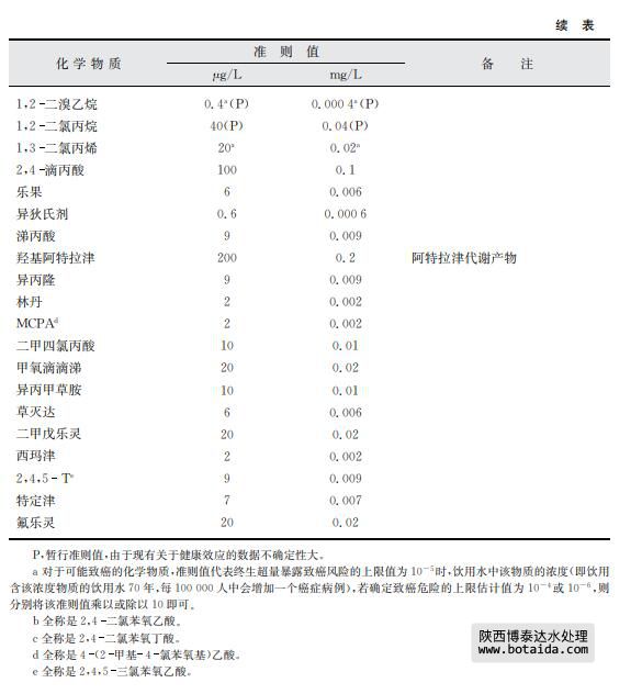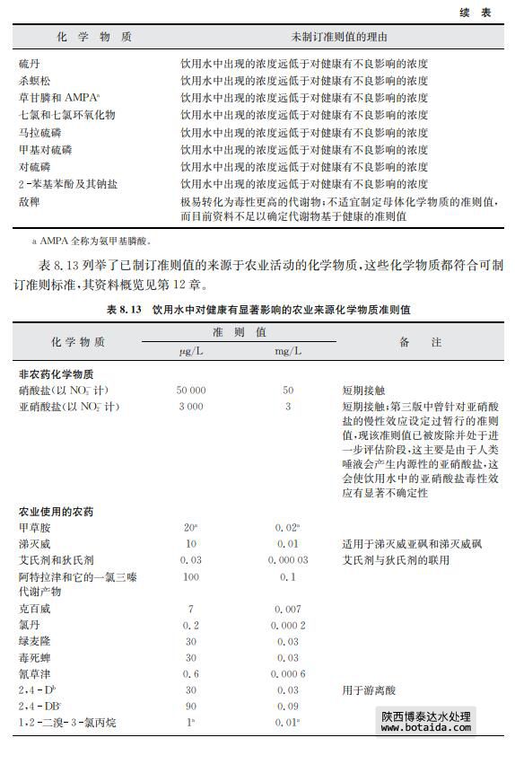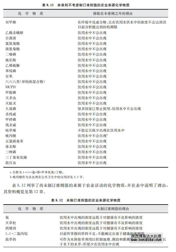 由于一些關于飲用水中存在化學物質以及其穩(wěn)定性的文獻有明顯證據指出某些農業(yè) 來源的化學物質不會出現(xiàn)在飲用水中,對于此類化學物質本準則不考慮建立準則值(見表 8.11)。