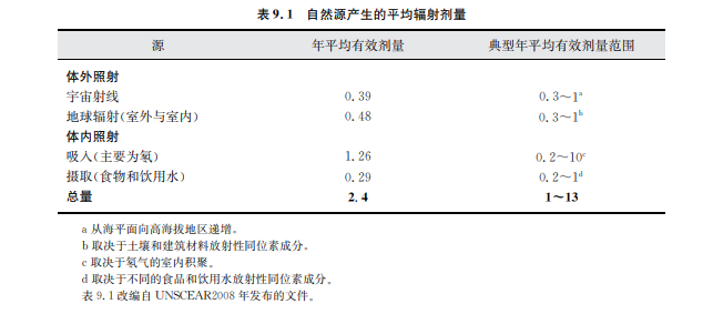 據(jù)聯(lián)合國(guó)輻射效應(yīng)科學(xué)委員會(huì)估計(jì)(UNSCEAR,2008),全球每人接受來(lái)自環(huán)境中所有 放射源的年平均劑量約為3.0mSv/年(物理量解釋見(jiàn)專欄9.1)。其中,80%(2.4mSv)來(lái)自 自然源,19.6%(接近0.6mSv)來(lái)自醫(yī)療診斷輻射,而剩下的0.4%(約0.01mSv)來(lái)自于其 他人工源(見(jiàn)圖9.1)。對(duì)于整個(gè)人群,每個(gè)人所接受的輻射劑量變化很大,取決于居住地點(diǎn)、 飲食規(guī)律和生活方式等因素。個(gè)人輻射劑量也可能因醫(yī)療暴露和職業(yè)暴露而不同。表9.1 列出了年平均劑量和天然來(lái)源個(gè)人輻照劑量的典型范圍(UNSCEAR,2008)。