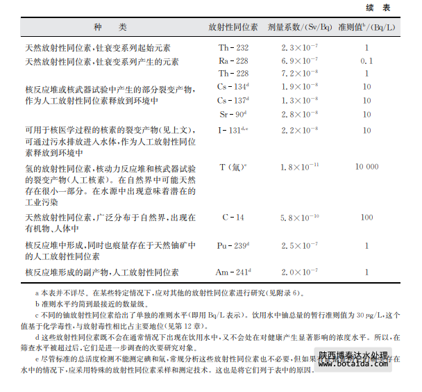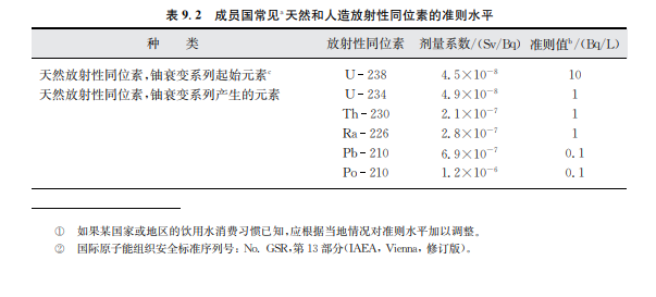 從放射學的角度,超過準則值的程度也是一個需要考慮的關鍵問題。防護電離輻射和輻 射源安全的國際基本安全標準在有關現(xiàn)有暴露的章節(jié)提到了飲用水并提出由使用飲用水帶來 的個人年最高輻射劑量最大不能超過約1mSv②。這一水平不應被當作“可接受的”水平或限 制性水平,并應盡可能地采取有效措施減少受到的輻射水平。每種超過準則水平的情況不同, 在做出最后的決定之前還需要考慮一些非放射方面的因素(如補救措施的經(jīng)濟成本、其他供水 源的實用性)。政府的有關部門應意識到,放射性同位素(如鈾)同時具有化學毒性,那么在水 中的允許濃度可能需要以其同位素的毒性確定,而不是依據(jù)放射性(見第12章)。