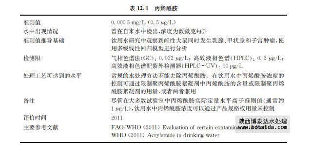 用聚丙烯酰胺絮凝劑處理飲用水時會造成丙烯酰胺單體的殘留(見表12.1)。通常,水 中該聚合物的最大允許用量為1mg/L。當(dāng)聚合物中單體的含量占0.05%時,水中相對應(yīng)的單體最大的理論濃度相當(dāng)于0.5μg/L。實際使用中,濃度可能比上述還要低2~3倍。這個 濃度適用于陰離子和非離子聚丙烯酰胺,而陽離子聚丙烯酰胺中單體的殘留水平可能會高 些。聚丙烯酰胺還可以用作建造飲用水蓄水池和水井的灌漿劑。人對其的攝入源于食物的 可能性多于源于飲用水:由于食物加工過程使用聚丙烯酰胺,而高溫烹調(diào)食物(例如面包、 油炸的和烤的食物)可能生成丙烯酰胺單體。