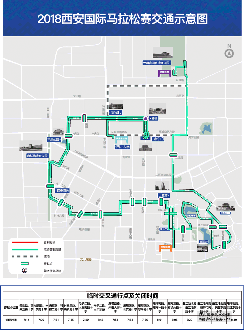 此次西安國際馬拉松的3項比賽起點均設在永寧門,為配合大賽舉辦,根據(jù)組委會要求,比賽當日地鐵二號線永寧門站將延遲至上午10點開站,自地鐵運營開始至10時,列車在永寧門站不停站通過,前往永寧門站的乘客可從相鄰的鐘樓站或南稍門站進出車站,由此給廣大乘客出行帶來的不便,請大家給予理解與支持。