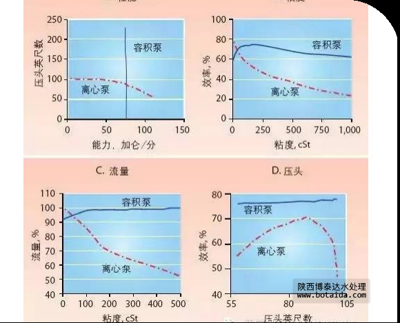 總的來(lái)說(shuō),在粘度超過(guò)150 cP時(shí),必須能夠在較廣范圍內(nèi)預(yù)測(cè)流量,或者在希望泵機(jī)能夠自行起動(dòng)灌注時(shí),可以考慮選用容積泵。在離心泵與容積泵之間進(jìn)行選擇時(shí),還要考慮到能耗問(wèn)題,因?yàn)檫@兩種泵在能耗方面可能會(huì)存在著相當(dāng)大的差別。這一點(diǎn)對(duì)于流量低于100加侖/分的情況是特別重要的,在這種情況下,離心泵工作效率的下降幅度會(huì)更大。