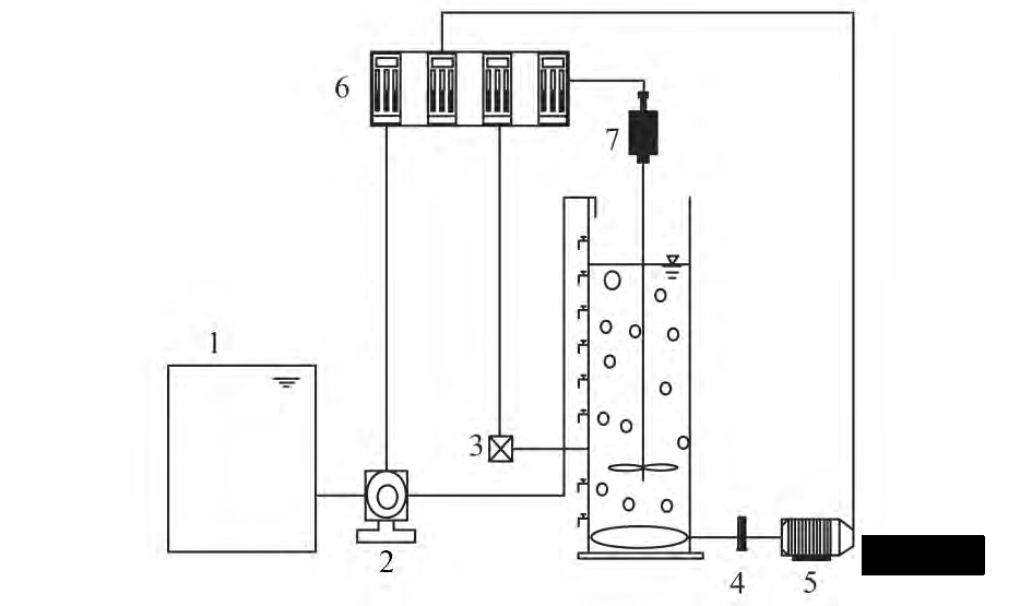 1. 進(jìn)水箱; 2. 蠕動泵; 3. 出水; 4. 氣體流量計; 5. 鼓風(fēng)機(jī) 6. 進(jìn)水、出水、攪拌、曝氣時序控制器; 7. 攪拌機(jī)