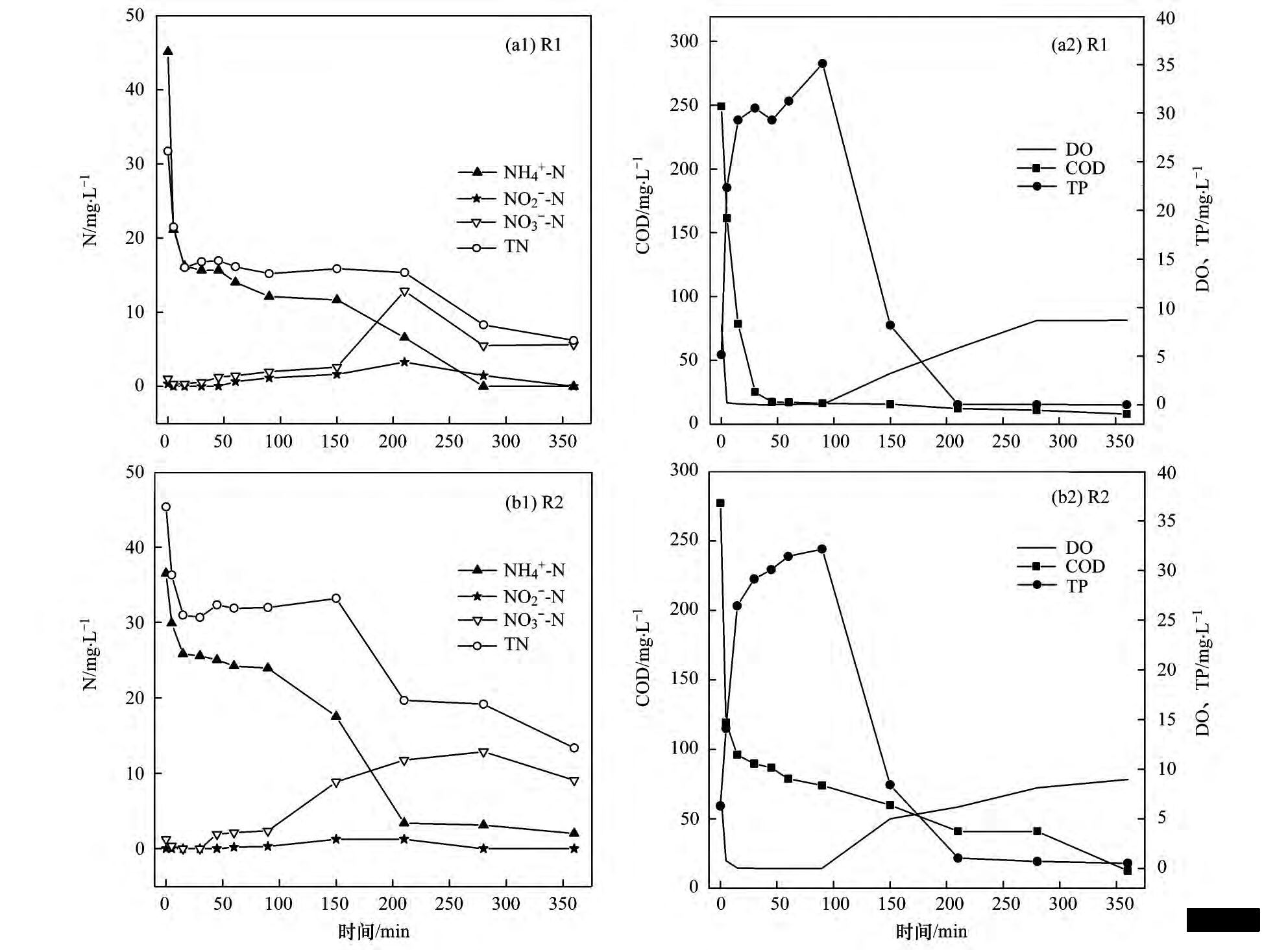 圖 5 R1 和 R2 反應(yīng)器去除 COD、TP、TN 和 NO - -N 的性能