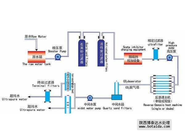 炭濾與軟化的工藝位置砂濾或超濾工藝對懸浮物、膠體與大粒徑有活性炭濾工藝存在吸附有機物及還原氧化劑的雙重功效。在吸附有機物方面,活性炭既可以其巨大的深孔內表面積吸附小粒徑有機物,又可以其有限的顆粒表面積吸附膠體與大粒徑有機物。由于膠體與大粒徑有機物在活性炭表面的附著將阻塞小粒徑有機物進入深孔的通路,活性炭工藝更適合于對小粒徑有機物的吸附。而混凝機物的截留起到了對活性炭的保護作用。砂濾或超濾工藝之后,在樹脂軟化工藝之前。活性炭對小粒徑有機物的去除作用,不僅可以保護反滲透膜免于有機物污染,還可有效保護軟化用樹脂不被有機物污染。因此活性炭工藝在預處理工藝流程中的位置一般在混凝氧化劑在反滲透系統(tǒng)中扮演著雙重角色,它既對反滲透膜及軟化樹脂形成氧化降解作用,又對預處理各工藝及管線中的微生物污染具有抑制作用?;钚蕴抗に囘€原氧化劑之后,系統(tǒng)流程各后續(xù)工藝將不受氧化劑保護,當系統(tǒng)原水溫度較高或微生物含量較高時,后續(xù)的交換樹脂將受微生物的威脅。因此,對于微生物含量較高、原水溫度較高、氧化劑含量較低的情況,活性炭濾工藝應置于離子交換工藝之后;對于微生物含量較低、原水溫度較低、氧化劑含量較高的情況,活性炭濾工藝應置于離子交換工藝之前。
