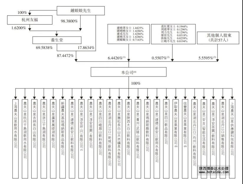 農(nóng)夫山泉上市后總股本大約為118.9億股,鐘睒睒通過旗下公司持股84.4%,從下圖可見,鐘睒睒持股高度集中,上市前沒有引入PE等機構,也沒有聯(lián)合創(chuàng)始人、高管分享其股權。