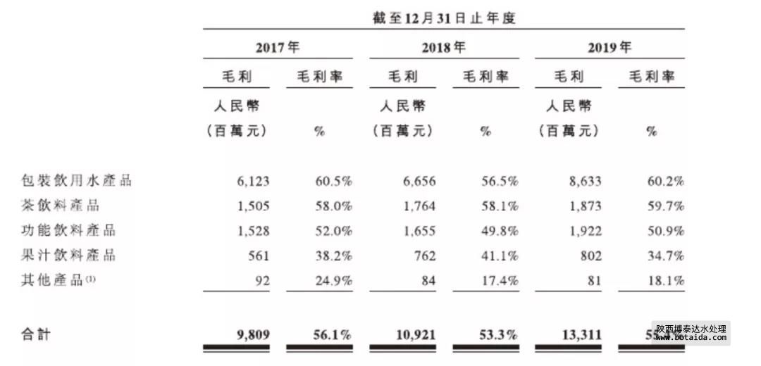 農(nóng)夫山泉的招股書顯示,公司的大類產(chǎn)品毛利率可謂是出奇的高,尤其是包裝飲用水產(chǎn)品,更是高達60.2%。此外,茶飲料和功能飲料的毛利率也超過50%,分別為59.7%和50.9%。