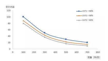 生物驗證是通過向紫外線消毒系統(tǒng)加入目標微生物,測定目標微生物的滅活率,反推紫外設(shè)備的劑量及消毒性能的。首先,用紫外平行光儀均勻照射已知濃度的目標微生物樣品,檢測照射后微生物濃度以確定滅活率。根據(jù)紫外強度、暴光時間等試驗因素,計算微生物的紫外線照射劑量,最終得到目標微生物的紫外線劑量-滅活率曲線。然后,進行紫外線反應器的測試,將驗證微生物加入到紫外線消毒系統(tǒng)的上游,在確定流量、UVT、UV功率等條件下,測定目標微生物的滅活率。根據(jù)檢測結(jié)果以及上述紫外線劑量-滅活率曲線,可得在不同紫外燈輸出功率和不同紫外線穿透率條件下,紫外線水消毒設(shè)備處理流量-劑量關(guān)系曲線,如圖1所示。圖1中UVT為水體紫外穿透率,橫坐標為設(shè)備所處理的流量,縱坐標為設(shè)備的實際劑量。