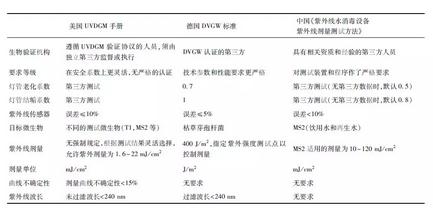 基于保障公眾利益的必要性,世界各國政府和監(jiān)管機構(gòu)針對紫外設(shè)備生物驗證方法推出了各自的驗證規(guī)范體系。國際公認的飲用水驗證規(guī)程有O-Norm(奧地利)、DVGW(德國)、NSF(美國)、UVDGM(美國),其中運用最廣的是德國的DVGW標準和美國的UVDGM指南。雖然這些標準規(guī)范有所差異,但根本要求是相同的,即都要求紫外設(shè)備的劑量用生物驗證法認定。