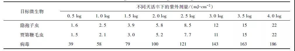 不同的微生物需要不同劑量的紫外線來滅活。因此,對于任何紫外線系統(tǒng),必須清楚需要滅活的微生物。表2介紹了滅活不同病原微生物所需的紫外線劑量。例如,要滅活99%(2 log)的隱孢子蟲需要5.8 mJ/cm2。要滅活99.99%(4 log)需要22 mJ/cm2。