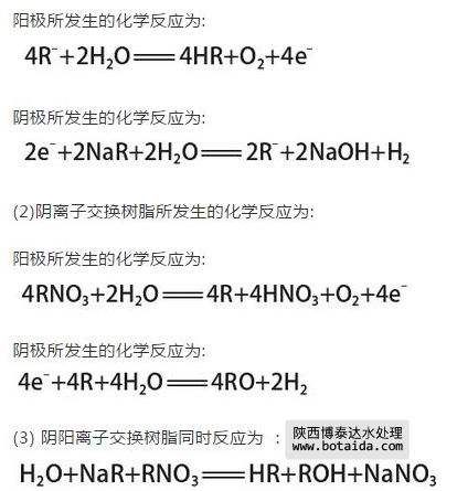 在利用滲析的極化過程中,由于在水溶液中會產(chǎn)生H+和OH-,使樹脂在化學(xué)反應(yīng)中進行電化學(xué)再生,這對水質(zhì)的提升具有正面的影響,而在再生的過程中,如果不進行離子交換處理,就會造成水質(zhì)變壞,這樣就需要采用適宜的工作環(huán)境,才能達到提高水質(zhì)的要求,采用EDI裝置的離子交換樹脂技術(shù),可以有效的提高水質(zhì)。具體的化學(xué)反應(yīng)方程式如下,