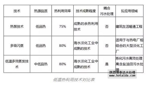 如低溫?zé)崂眉夹g(shù)對比表所示,較常規(guī)熱泵技術(shù)和多級閃蒸技術(shù),低溫多效蒸發(fā)在熱利用率、技術(shù)工藝耦合污水處理等方面具有明顯優(yōu)勢,代表了相關(guān)技術(shù)領(lǐng)域的發(fā)展方向,是開展余熱利用和污水處理耦合技術(shù)的重點方向。