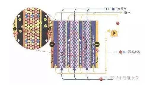 EDI膜堆主要由交替排列的陽(yáng)離子交換膜、濃水室、陰離子交換膜、淡水室和正、負(fù)電極組成。離子交換樹脂充夾在陰陽(yáng)離子交換膜之間形成單個(gè)處理單元,并構(gòu)成淡水室,單元與單元之間用網(wǎng)狀物隔開,形成濃水室。在直流電場(chǎng)的作用下,淡水室中離子交換樹脂中的陽(yáng)離子和陰離子沿樹脂和膜構(gòu)成的通道分別向負(fù)極和正極方向遷移,陽(yáng)離子透過(guò)陽(yáng)離子交換膜,陰離子透過(guò)陰離子交換膜,分別進(jìn)入濃水室形成濃水。同時(shí)EDI進(jìn)水中的陽(yáng)離子和陰離子跟離子交換樹脂中的氫離子和氫氧根離子交換,形成超純水(高純水)。超極限電流使水電解產(chǎn)生的大量氫離子和氫氧根離子對(duì)離子交換樹脂進(jìn)行連續(xù)的再生。傳統(tǒng)的離子交換,離子交換樹脂飽和后需要化學(xué)間歇再生。而EDI膜堆中的樹脂通過(guò)水的電解連續(xù)再生,工作是連續(xù)的,不需要酸堿化學(xué)再生。